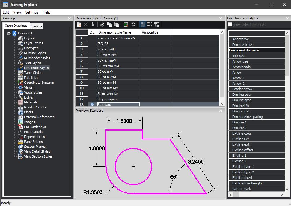 Los van de grafische inhoud bevat een DWG ook een aantal definities en instellingen die nodig zijn voor de weergave van de tekening. Deze instellingen zijn te vinden in de Drawing Explorer.