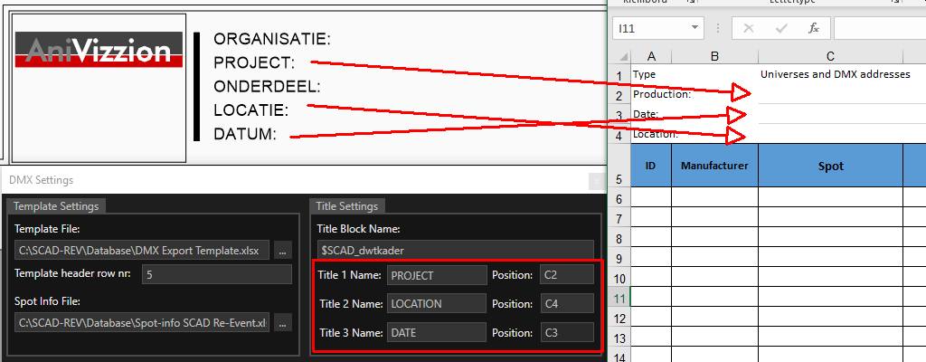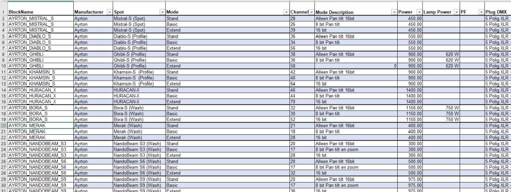Zodra de gegevens ingevuld zijn zal DMXEXPORT aan de hand van de template (ingesteld in DMXSETTINGS) de gegevens in een Excel bestand zetten. Het bestand krijgt de naam van de tekening en staat in de map van de tekening. Als hier wijzigingen worden gedaan en het bestand wordt gesaved (ctr-s) kan met DMXIMPORT de data weer worden ingelezen, de attributes worden aangepast aan hand van de inhoud van het Excel bestand. Zorg ervoor dat het Excel bestand gesloten is als dit commando wordt uitgevoerd.