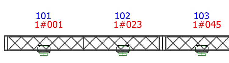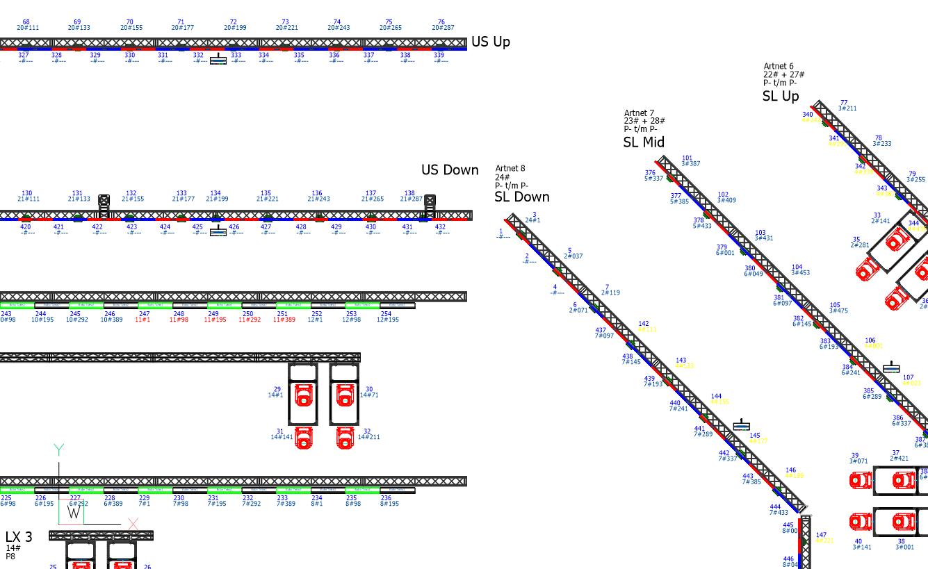 De patch module van SCAD Re-event werkt dus met een block met attributen die de gegevens van de lamp bevatten. De lamp zelf, zoals deze in de bibliotheek staat, heeft geen attributes nodig. Het grote voordeel hiervan is dat het block met de gegevens (attributes) altijd netjes geplaatst kan worden, zonder dat er teksten door een truss of een lamp geschreven staan. Zoals in de afbeelding helemaal boven in is te zien staan de patch gegevens goed leesbaar in de tekening.