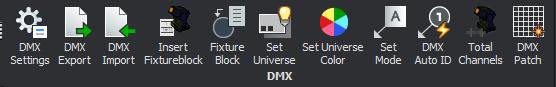 DMXINSERT: Voegt het Fixtureblock in, waarbij elke volgende insert een nieuw ID, adres en eventueel Universe krijgt. Vul het start ID, Universe en Adres in en zet de mode goed zodat de juiste hoeveelheid kanalen gebruikt worden.