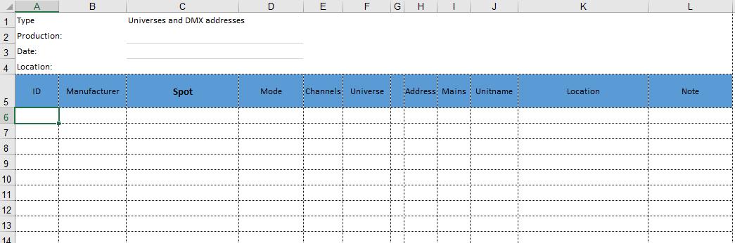 DMX Template: Bij uitvoer van de patchlijst wordt een bestand gebruikt waarin de gegevens komen. Standaard is dit DMX Template.xlsx en staat ook in de Database map.
