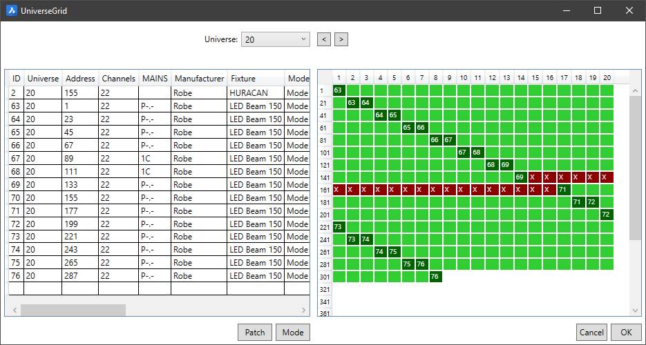 DMXPATCH Vult de adressen in aan de hand van de mode van de lamp in de volgorde van de ID. Als het nodig is om een nieuwe Universe aan te maken (adressen boven de 512) wordt daar melding van gemaakt.