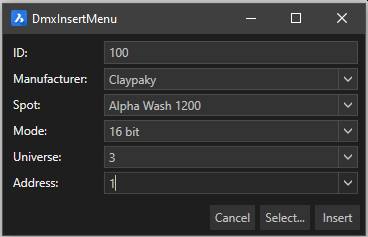 De Select.. knop vraagt om een lamp die uit de SCAD Re-Event bibliotheek komt, als de gegevens worden gevonden worden deze overgenomen in het menu. Bij elke volgende insert wordt het adres opgehoogd naar het volgende vrije adres