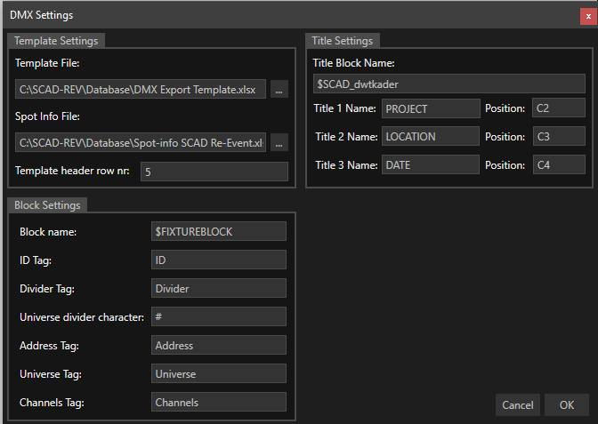 $FIXTUREBLOCK.DWG Dit is het block dat de attributes (gegevens) bevat van een lamp (mode, universe, adres enz.). Het block mag een andere naam hebben als het maar ingesteld staat in de settings. Standaard staat dit block in c:\scad-rev\support.