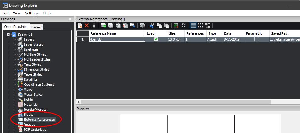In de Drawing Explorer (commando EXPLORER) staan de ingeladen Xref's.