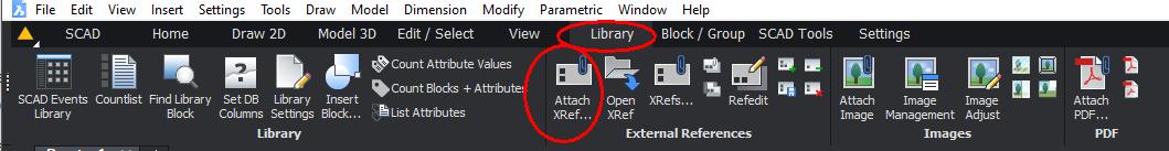 Een Xref wordt toegevoegd met het commando XATTACH, te vinden in de ribbon onder Library: