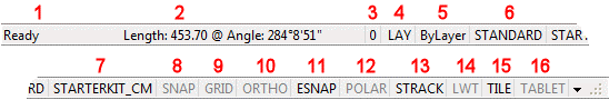 De statusbalk bevindt zich langs de onderrand van het toepassingsvenster SCAD. Het bevat veel informatie over de instellingen in de huidige tekening. De statusbalk bestaat uit 16 velden. Al deze velden zijn optioneel, behalve het veld Status. Een lijst van alle velden wordt weergegeven als u klikt op de kleine zwarte ▼ aan de rechterkant van de statusbalk. Klik op een veld om de weergave in-van uitschakelen.