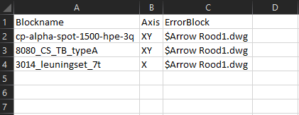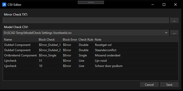Ook blocks die gespiegeld zijn om een bepaalde as, maar dit niet mogen zijn, kunnen worden gevonden met modelcheck. Hiervoor is een CSV bestand nodig met blocknamen, de as(sen) waarover ze niet mogen worden gespiegeld en het block dat ingevoegd wordt wanneer er een fout gevonden wordt. Dit bestand moet worden gekozen in het MODELCHECKSETTINGS menu.