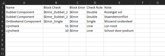 MODELCHECK kan fouten vinden als dubbel gebruik van een rozetgat, schoren die door een plaat gaan, missende aansluitingen op staander met pen, enz. Op de plek van de fout wordt een block ingeladen, meestal een pijl o.i.d. De werking is gebaseerd op de regels in het instellingsbestand. Dit is een CSV bestand met de volgende kolommen: