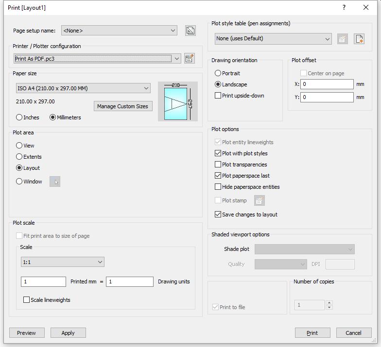 Shade Plot - choose a shade style plot the drawing with. This option is disabled when printing a paper space layout. The Shade Plot mode of a paper space viewport is defined in the Shade Plot property of the viewport. The quality of the Rendered option is defined through the current render preset; see the RenderPresets command. |