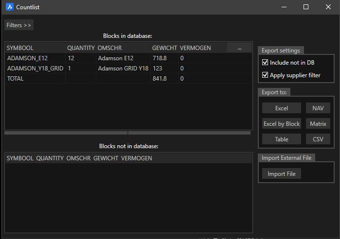 COUNTLIST: Telling geeft nu dezelfde resultaten als postcalc. Exporteren: Gewicht en vermogenskolommen tonen nu het totale gewicht (werd niet correct vermenigvuldigd met het aantal in eerdere builds) Exporteren: Blokken worden nu correct gesorteerd op de Sorteerkolom. Selectievakje toegevoegd aan de kolomselectie om kolommen te selecteren die moeten worden opgeteld. Als er geen kolommen zijn geselecteerd, wordt er tijdens het exporteren geen totaal regel afgedrukt.